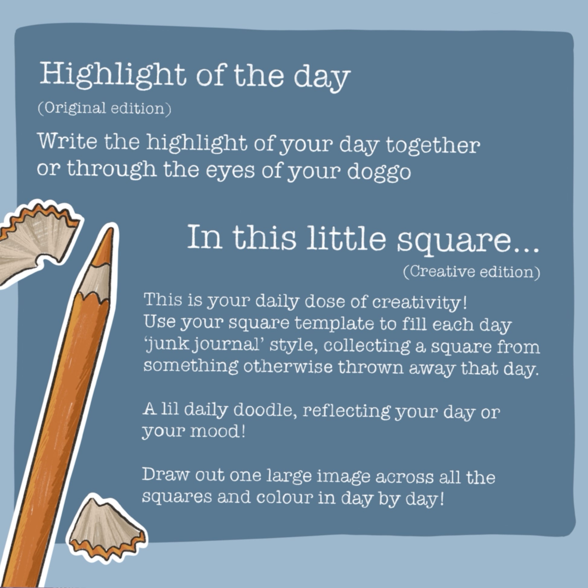 This is your daily dose of creativity. Use your square template (included) to fill each day 'junk journal' style, collecting a square from something otherwise thrown away that day.